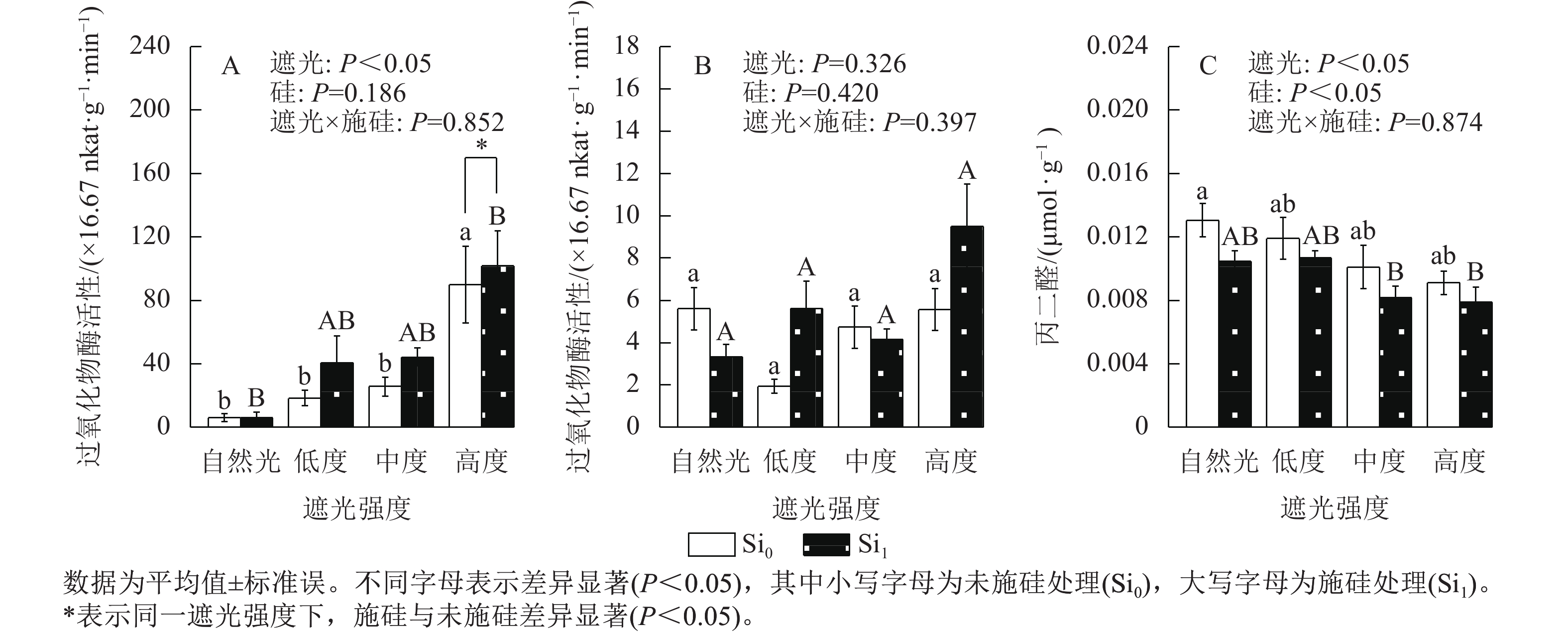Objective This study aims to explore the adaptation mechanism of Platycladus orientalis seedlings to weak light environment and clarify the alleviation effect of exogenous silicon on shading stress. Method Three-year-old P. orientalis seedlings were used as materials, covered with black nylon mesh, and subjected to four shading gradients: natural light, low shading, moderate shading, and high shading. Combined with 0 (Si0) and 2 mmol·L−1 (Si1) sodium silicate exogenous silicate treatment levels, a total of eight treatments were randomly set up. Physiological indicators such as growth, photosynthetic pigments, osmotic regulation, and antioxidant physiology of seedlings under different treatments were measured, and low-light adaptation characteristics of seedlings and the regulatory effect of silicon were analyzed Result (1) Shading treatment significantly inhibited the growth of ground diameter of P. orientalis by 5.18%−40.51% (Ρ<0.05). The silicon treatment promoted the growth of ground diameter, and the thickening rate reached 4.72%−16.67%. The shading environment promoted plant height growth, but under natural light and low to moderate shading conditions, silicon application treatment inhibited plant height growth, indicating that silicon application within a certain range of light intensity exerted a dual regulatory effect of ‘ground diameter thickening-apical inhibition’. (2) As the light intensity decreased, the contents of chlorophyll a and b increased, while chlorophyll a/b showed a downward trend, which was beneficial to improving the capture efficiency of the photosynthetic system at week light intensity. (3) Light shading induced dynamic responses of osmotic regulatory substances. Soluble sugars and proline first increased then declined, while soluble proteins exhibited the inverse trend, which activated the antioxidant protection system such as elevating peroxidase (POD) and catalase (CAT) activities and reducing malondialdehyde (MDA) (Ρ<0.01) content. Exogenous silicon enhanced osmotic regulation and antioxidant capacity, soluble sugars (SS) and proteins (SP) contents and POD activity, while reducing the mass molar concentration of MDA. Conclusion P. orientalis seedlings enhance their light capture capacity by increasing chlorophyll synthesis and activating antioxidant enzymes to improve their shade tolerance. Exogenous silicon can optimize morphogenesis to varying degrees, and enhance the osmotic regulation and antioxidant properties, thereby improving the ability of the seedlings to resist weak light stress. [Ch, 4 fig. 2 tab. 39 ref.]