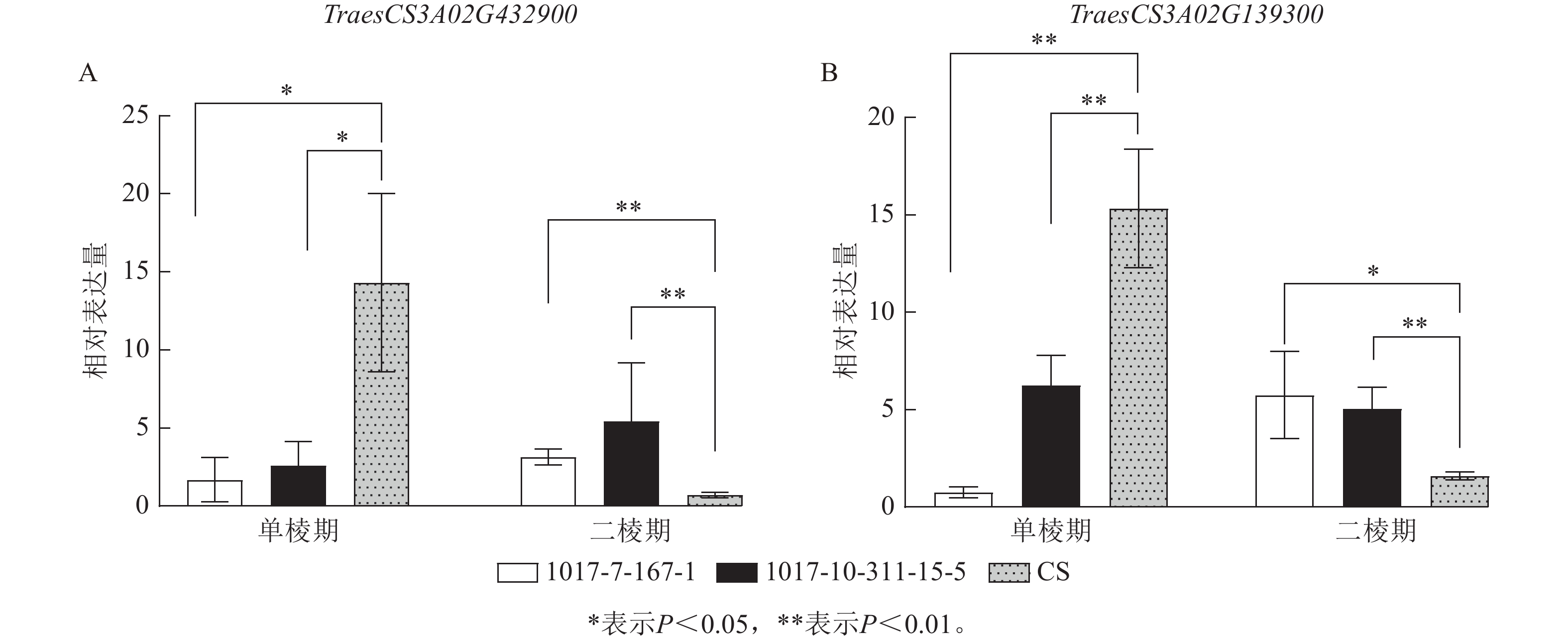 Objective Heading date of Triticum aestivum is a key agronomic trait determining yield and quality. T. aestivum ‘Chinese Spring’ (CS)-T. turgidum var. dicoccoides chromosome arm substitution line CASL3AL exhibits early heading under multi-environment cultivation. This study investigates the regulatory genes during critical stages of young spike development through transcriptome analysis. Method This study utilized recombinant inbred lines (RILs) derived from the cross between the wild emmer wheat chromosome arm substitution line CASL3AL and CS as materials, screening stable early-maturing lines (1017-7-167-1 and 1017-10-311-15-5) and the late-maturing parent CS. Main stem leaves at the single ridge stage (W1.5) and double ridge stage (W2.5) were collected for transcriptome sequencing (RNA-Seq). Results The homozygous single nucleotide polymorphism (SNP) loci of 2 early-maturing lines were predominantly enriched in chromosome 3A. Differential expression analysis revealed: 4 172 differentially expressed genes (DEGs) were identified at single ridge stage and 169 at double ridge stage in line 1017-7-167-1, while 1 065 and 172 DEGs were detected in line 1017-10-311-15-5 at corresponding stages. Gene ontology (GO) enrichment analysis indicated these DEGs were primarily involved in biological processes such as circadian rhythm and floral organ development. Based on SNP enrichment results and expression differences, 2 candidate genes (TraesCS3A02G432900 and TraesCS3A02G139300) were identified within the SNP-enriched region of chromosome 3A. Conclusion This study identified candidate genes from wild emmer wheat that promote early heading in common wheat, providing a theoretical foundation for wheat growth period improvement. [Ch, 9 fig. 1 tab. 32 ref.]