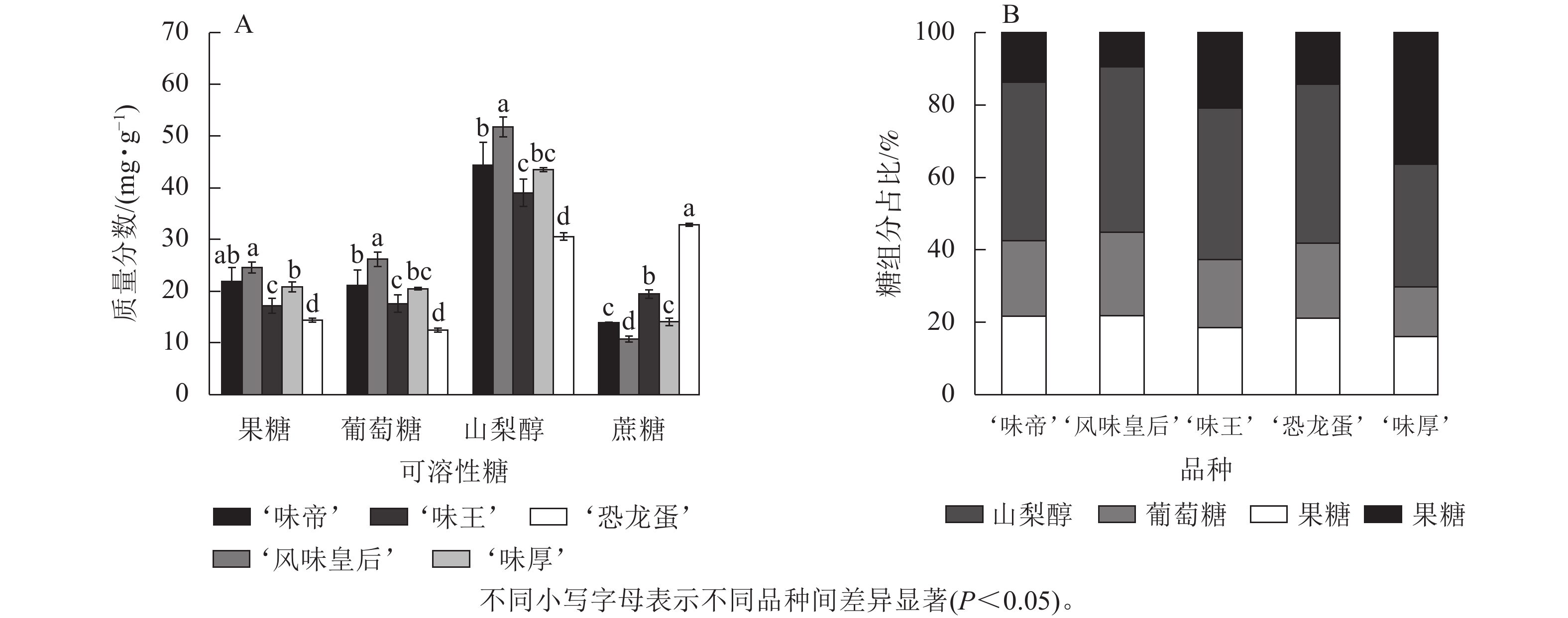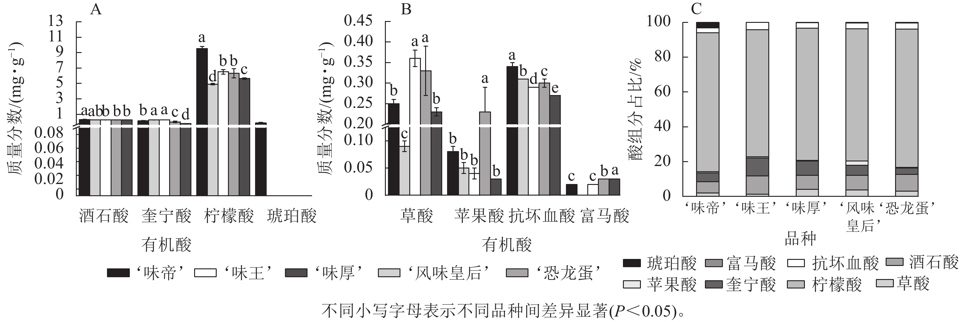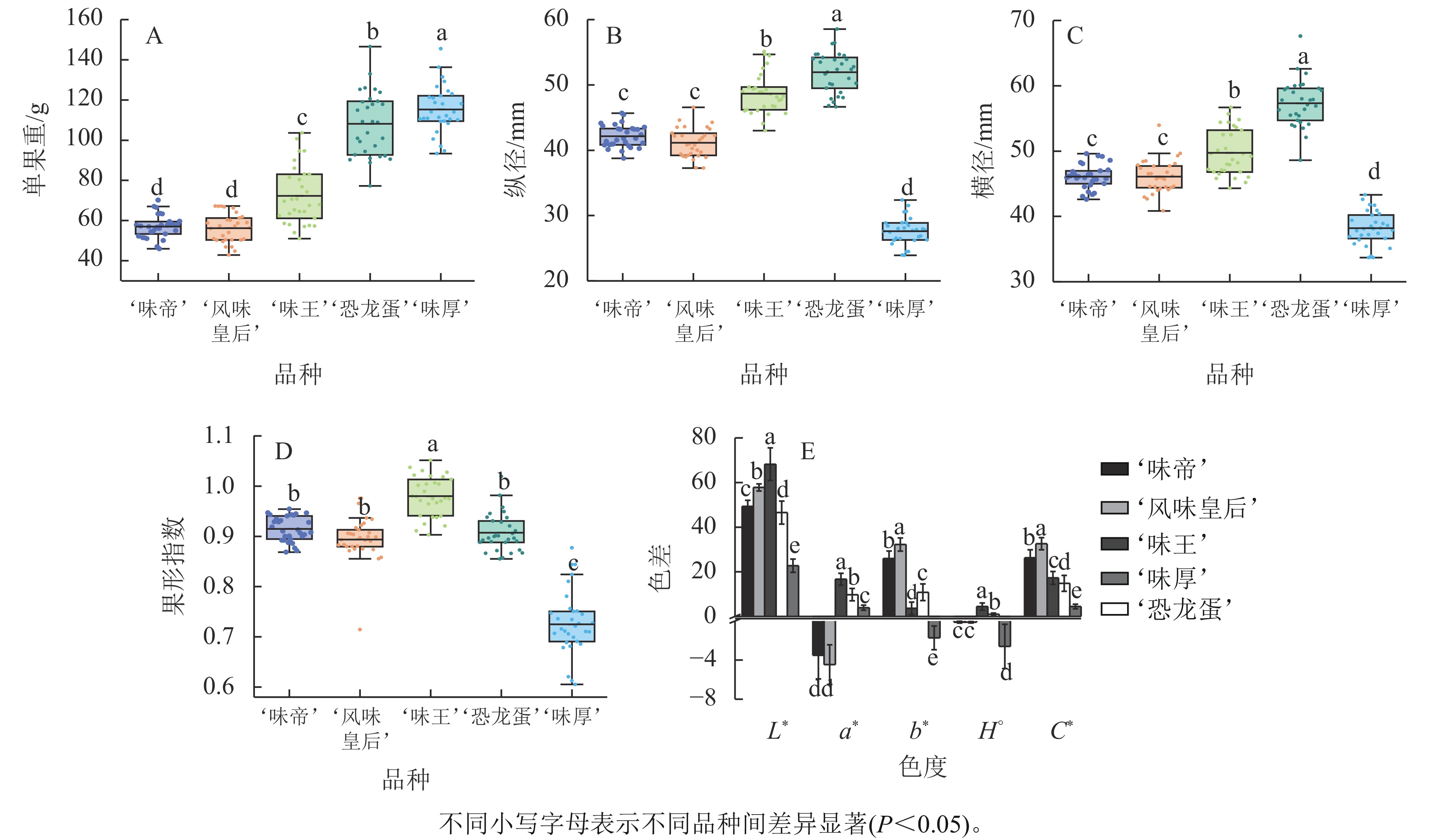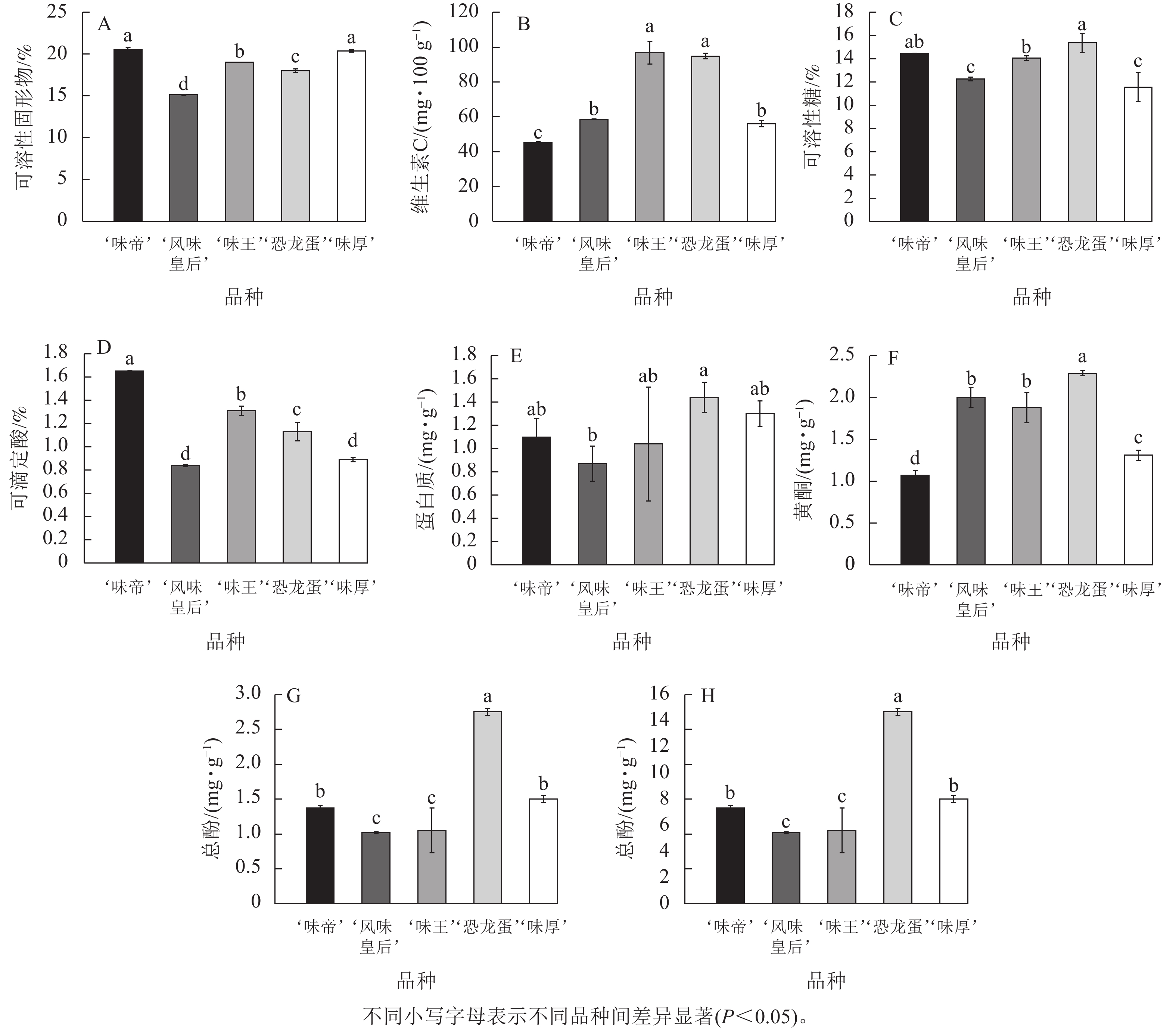 Objective The research aimed to explore the differences of fruit morphological characteristics, fruit appearance, fruit texture and fruit internal quality of five Prunus simonii varieties in Aksu Prefecture, and put forward the excellent Prunus simonii cultivars suitable for Aksu Area. Method In 2024, a field experiment was conducted in a P. simonii orchard in Jiamu Town, Wansu County, Aksu Prefecture, Xinjiang. Five 6-year-old cultivars were used to determine and analyze the differences in fruit quality, including fruit appearance, fruit texture, soluble sugar, soluble solids, titratable acid, vitamin C, and sugar-acid components. Result In terms of appearance, the average single fruit weight of ‘Konglongdan’ and ‘Weihou’ is 100−120 g, and the other three cultivars are 50−80 g; the L* value and a* value of ‘Weiwang’ were 68.23 and 16.68, respectively, and the fruit color was bright. In terms of nutrition, ‘Weiwang’ had the highest vitamin C content of 0.967 8 mg·g−1 ; the soluble sugar content of ‘Konglongdan’ was the highest, which was 15.37%, and the titratable acid content of ‘Weidi’ was the highest, which was 1.65%. The soluble solids content of ‘Weidi’ was the highest, which was 20.47%. The flavonoids, total phenols and soluble protein of ‘Konglongdan’ were the highest, which were 2.29, 2.75 and 1.44 mg·g−1, respectively. In terms of sugar and acid components, the sugar component is mainly sorbitol accumulation, and the acid component is mainly citric acid accumulation.The fructose, glucose and sorbitol of ‘Fengweihuanghou’ were significantly higher than those of other cultivars (P<0.05), and the sucrose of ‘Weihou’ was 32.83 mg·g−1, which was significantly higher than that of the other four cultivars (P<0.05). The citric acid and ascorbic acid of ‘Weidi’ were significantly higher than those of the other four cultivars (P<0.05), with the contents of 10.03 and 0.34 mg·g−1, respectively. In the acid category, only ‘Weidi’ contains succinic acid, but ‘Fengweihuanghou’ does not contain fumaric acid. The fruit quality was comprehensively evaluated by principal component analysis, and the scores from high to low were ‘Konglongdan’ ‘Weiwang’ ‘Weihou’ ‘Fengweihuanghou’ and ‘Weidi’. Conclusion The sugar and acid of ‘Weidi’ are balanced, and the taste is relatively soft, but the fruit is relatively small, so the ranking is relatively backward. From the comprehensive point of view of fruit quality: ‘Konglongdan’ not only has large fruit, but also has high and relatively balanced nutrients, which is more suitable for large-scale planting in Aksu area. [Ch, 5 fig. 6 tab. 37 ref.]
