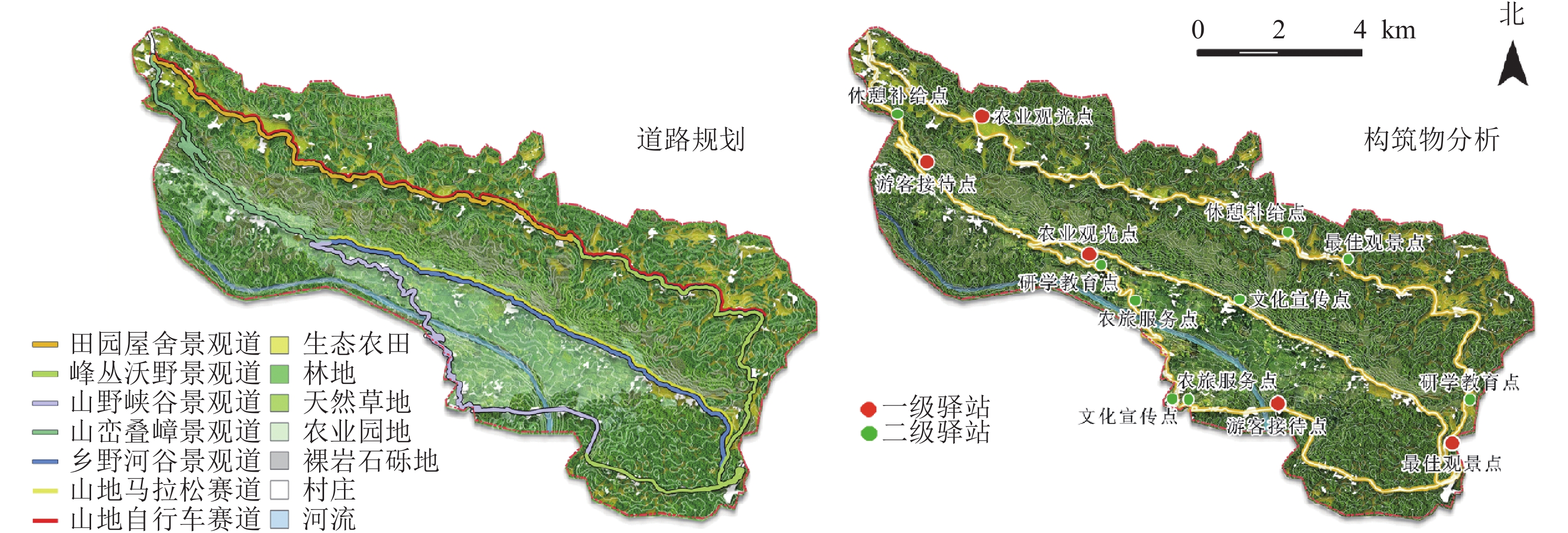 Objective It is of great significance to explore the rational layout of ecological-living-production space in karst scenic byway to promote the high-quality development of scenic byway in ecologically fragile areas and optimize the national space. Method This study focused on the karst mountainous area of the Huajiang section of the Beipan river, and constructed a spatial suitability evaluation framework for the karst scenic byway that encompassed ecological, living, and production spaces. After identifying and categorizing the spatial elements of the karst scenic byway, the criteria for spatial suitability evaluation were established. Using GIS spatial overlay analysis technology, the study evaluated the spatial development and construction suitability of the karst scenic byway and proposed targeted landscape planning strategies accordingly. Result (1) The most suitable and highly suitable areas for the development of the karst scenic byway account for a small proportion, while the moderately suitable, low suitable and unsuitable areas account for a large proportion. (2) It is suggested that the development of unsuitable and low suitable areas should be strictly restricted, and ecological conservation corridors should be established, and priority should be given to the restoration of ecologically fragile areas. (3) It is planned to build karst ecological display corridor in the area with high ecological function, recreational and sightseeing corridor in the area with living-function suitability, and develop karst ecological agriculture in the area with production potential. (4) The theme segmentation design divided the Huajiang karst scenic byway into 5 sections: pastoral cottages, peak cluster and fields, mountain and valley, mountain range, and rural river valleys. On this basis, the route of road culture event was planned reasonably, and 14 station nodes are set up in suitable areas. Conclusion This study reveals the suitability of spatial development and construction along the Huajiang karst scenic byway, along with its spatial distribution characteristics. It also proposes landscape planning strategies aimed at promoting the coordinated development of ecological protection, recreational activities, and agricultural production. The planning method for karst scenic byway, based on the suitability evaluation of production-living-ecological spaces, can effectively guide the rational layout and protective development of functional spaces in ecologically fragile areas. [Ch, 6 fig. 4 tab. 25 ref.]
