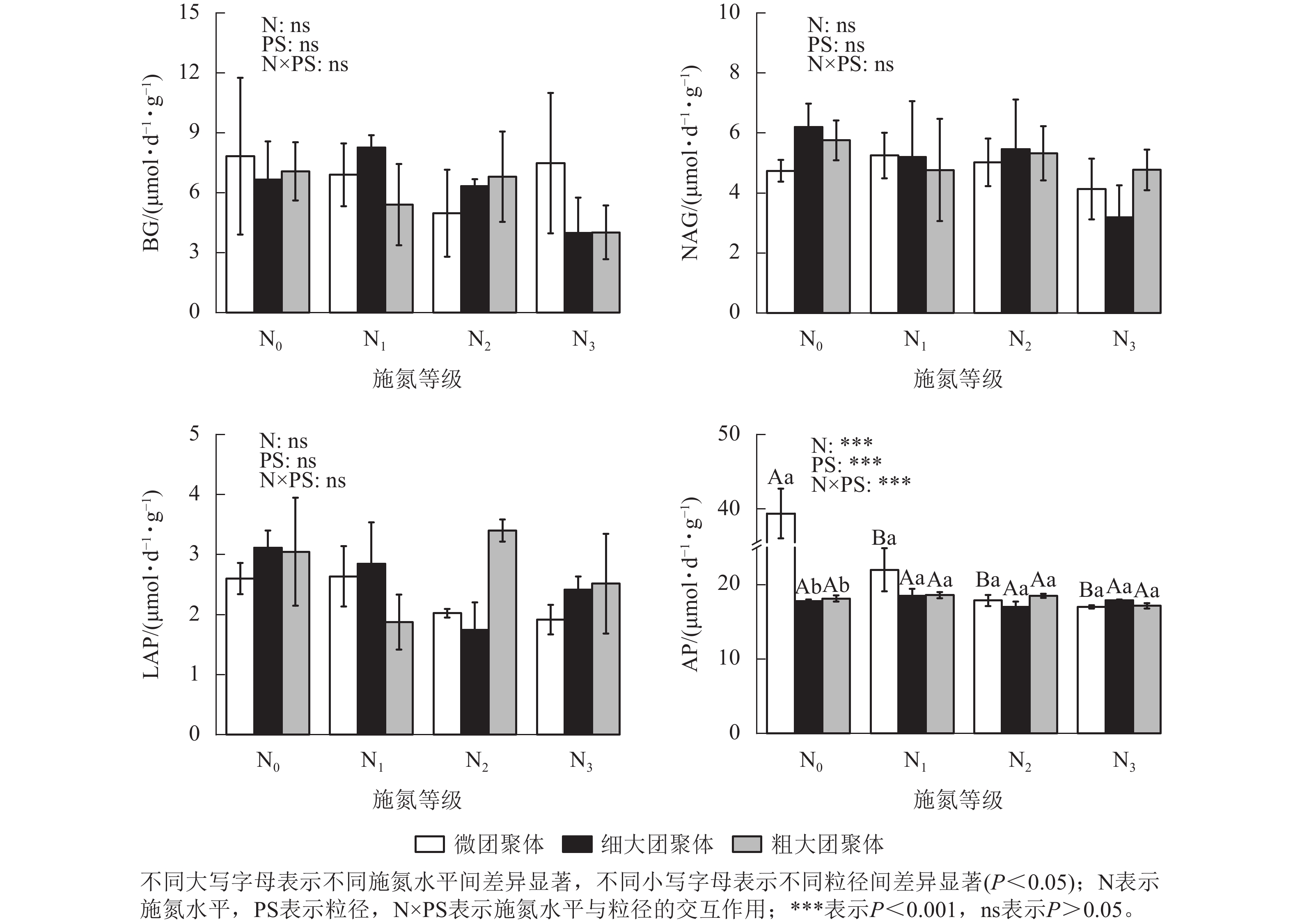 Objective This study investigates the responses of microbial biomass carbon, nitrogen, and phosphorus (MBC, MBN, MBP), hydrolytic enzyme activities and their stoichiometric characteristics in soil aggregates of Chinese fir plantations to long-term nitrogen (N) addition, thereby providing a basis for assessing the impacts of nitrogen deposition on micro-scale processes in subtropical forest soils. Method Based on a long-term N addition experiment established in 2004 (with four N addition gradients: 0, 60, 120, and 240 kg N·hm−2·a−1), soil aggregates (0–10 cm depth) were collected in 2024. These aggregates were separated into three size fractions: coarse macroaggregates (>2.00 mm), fine macroaggregates (0.25–2.00 mm), and micro-aggregates (<0.25 mm). Analyses were conducted on the contents of MBC, MBN, MBP, hydrolytic enzyme activities, and their stoichiometric within these aggregates. Result Compared to microaggregates, fine and coarse macroaggregates exhibited 23.61% and 32.65% lower MBN content, but 16.74% and 27.27% higher MBP content, respectively. Their MBC/MBN ratios ewere 13.87% and 22.84% higer, respectively. Under the N1 treatment, the MBC/MBP and MBN/MBP ratios in microaggregates were 97.57% and 85.51% higher than those under N0. Furthermore, the MBC/MBP ratios in fine and coarse macroaggregates were 53.72% and 64.43% lower than those in microaggregates, while their MBN/MBP ratios were 60.25% and 72.89% lower, respectively. Long-term N addition decreased acid phosphatase (AP) activity in microaggregates by 44.14%–56.67%. Under the N0 treatment, fine and coarse macroaggregates showed 54.84% and 53.92% lower AP activity compared to microaggregates. No significant changes were observed in other enzyme activities. The aggregate enzyme C/P and N/P ratios were lower than global averages and unaffected by N addition. A negative correlation was found between the MBC/MBN ratio and AP activity. Conclusion Under long-term N addition, microaggregates demonstrated the strongest response. N input drives a shift in microbial nutrient allocation strategies by restructuring aggregate composition, manifesting as enhanced phosphorus (P) capture coupled with reduced N storage in macroaggregates, while microaggregates maintaine a strategy of high P retention. Concurrently, microorganisms respond to P limitation in this subtropical Chinese fir forest ecosystems by reducing microbial biomass accumulation and regulating phosphatase synthesis. [Ch, 5 fig. 42 ref.]