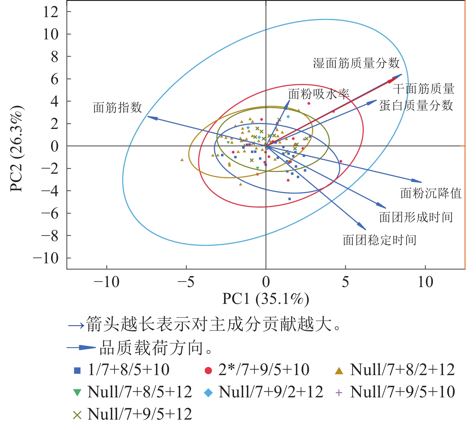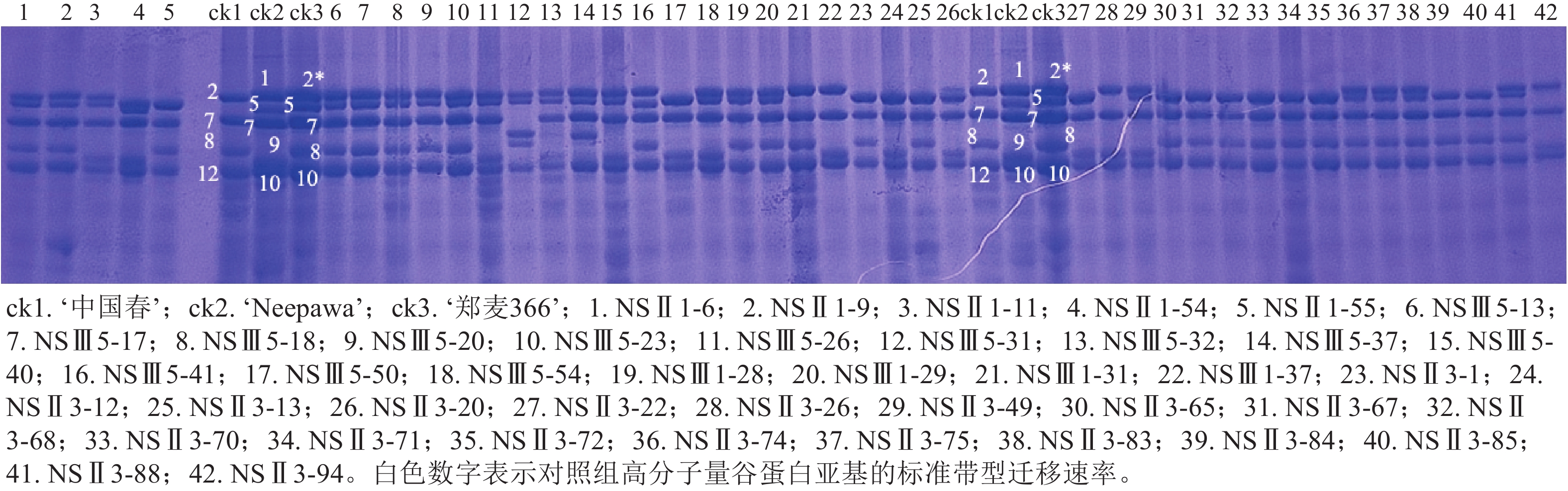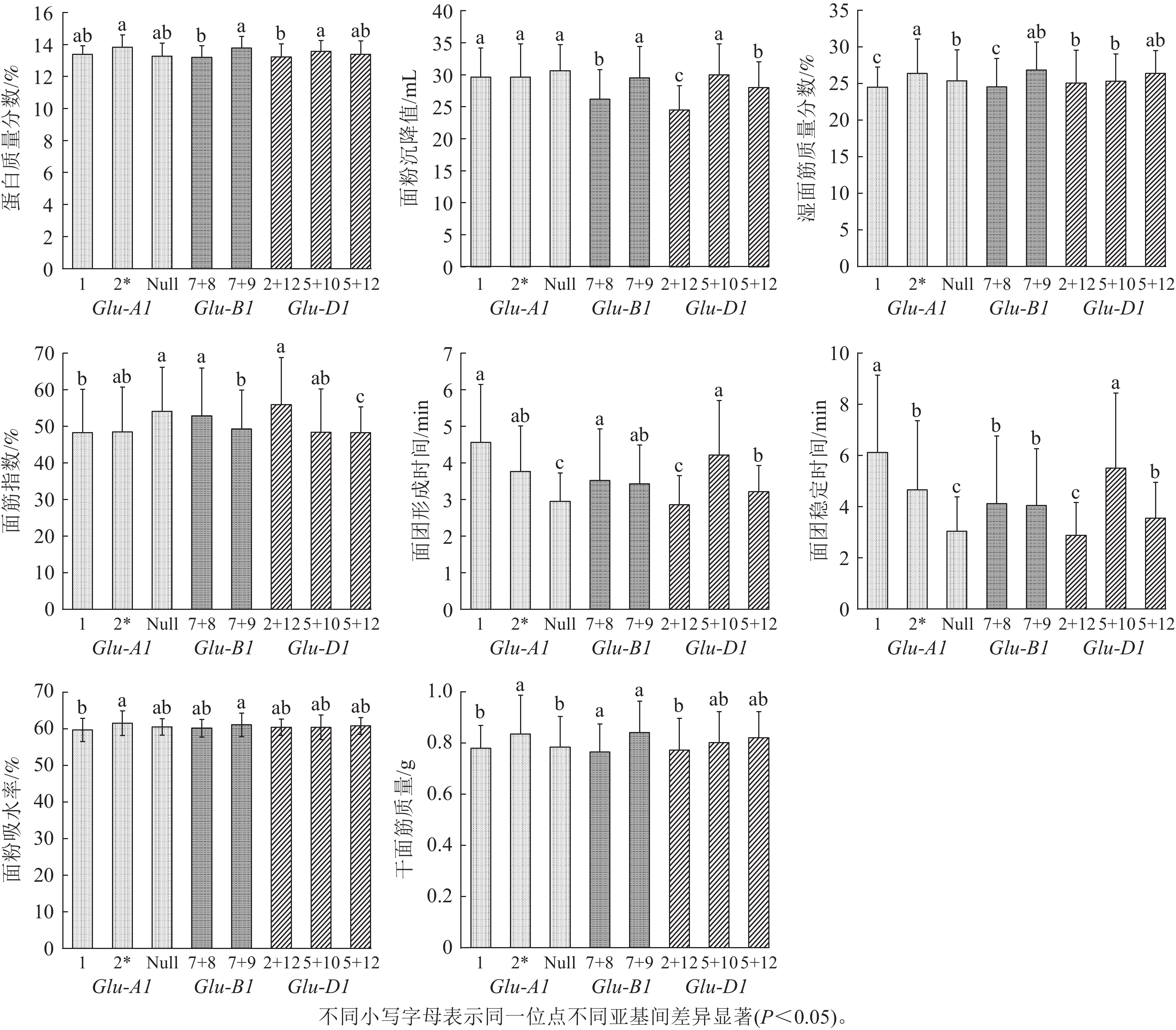 Objective The aim of this study is to investigate the relationship between the composition of high molecular weight gluten subunits (HMW-GS) in wheat (Triticum aestivum) and wheat quality traits. Method Using 106 high-generation wheat lines as materials, the potential quality of each line was predicted by identifying the HMW-GS subunit type. Using SDS-PAGE (sodium dodecyl sulfate-polyacrylamide gel electrophoresis) and molecular marker techniques, HMW-GS identification and quality assessment were performed by near-infrared grain analyzer, flour texture analyzer, and gluten tester. Result A total of 8 types of HMW-GS subunits and 7 HMW-GS subunit combinations were identified in 106 wheat lines. There were 3 subunits at the Glu-A1 locus, namely x1 (24.53%), x-null (57.55%), and x2* (17.92%). At the Glu-B1 locus, there were 2 types: x7+y8 (64.15%) and x7+y9 (34.91%). At the Glu-D1 locus, there were 3 types: x2+y12 (43.4%), x5+y10 (42.45%), and x5+y12 (15.09%). There were 7 types of subunit combinations, with quality scores ranging from 5 to 10 points. Among them, the 2*/7+9/5+10 and 1/7+8/5+10 combinations had the highest scores of 10 points each. The specific polymerase chain reaction (PCR) molecular markers were used to identify the Ax1, Ax-null, Dx2, Dx5, Dy10, Dy12, Bx7, and By8 subunits within the HMW-GS subunits. The results were compared with those obtained by SDS-PAGE electrophoresis, and the agreement rates were 100%, 100%, 91.83%, 96.69%, 97.78%, 100%, 100%, and 76.92%, respectively. Correlation analysis between HMW-GS subunit positions and quality traits revealed that the 2*, 7+9, and 5+10 subunits exhibited higher protein content, flour sedimentation value, and water absorption capacity compared to other subunits (P<0.05). The 1, 7+8, and 5+10 subunits had significantly higher flour sedimentation value, dough formation time, and dough stability time than other subunits (P<0.05). Among them, the 7+9 subunit exceeded the 7+8 subunit in protein content, dry gluten content, wet gluten content, and flour sedimentation value (P<0.05). Correlation analysis and principal component analysis of HMW-GS subunit combinations and quality traits revealed that the 1/7+8/5+10 and 2*/7+9/5+10 combinations exhibited superior comprehensive quality characteristics and contributed significantly to quality traits, while Null/7+8/2+12 and the Null/7+9/2+12 combinations performed poorly. Meanwhile, heat map analysis and cluster analysis of high-generation lines found that there were extremely significant differences among various quality traits (P<0.01), which could be clustered into 5 distinct groups. Conclusion The impact of subunits at each position on the quality traits varies, with significant effects on sedimentation value, dough formation time, dough stability time, and wet gluten mass fraction. [Ch, 6 fig. 5 tab. 39 ref.]