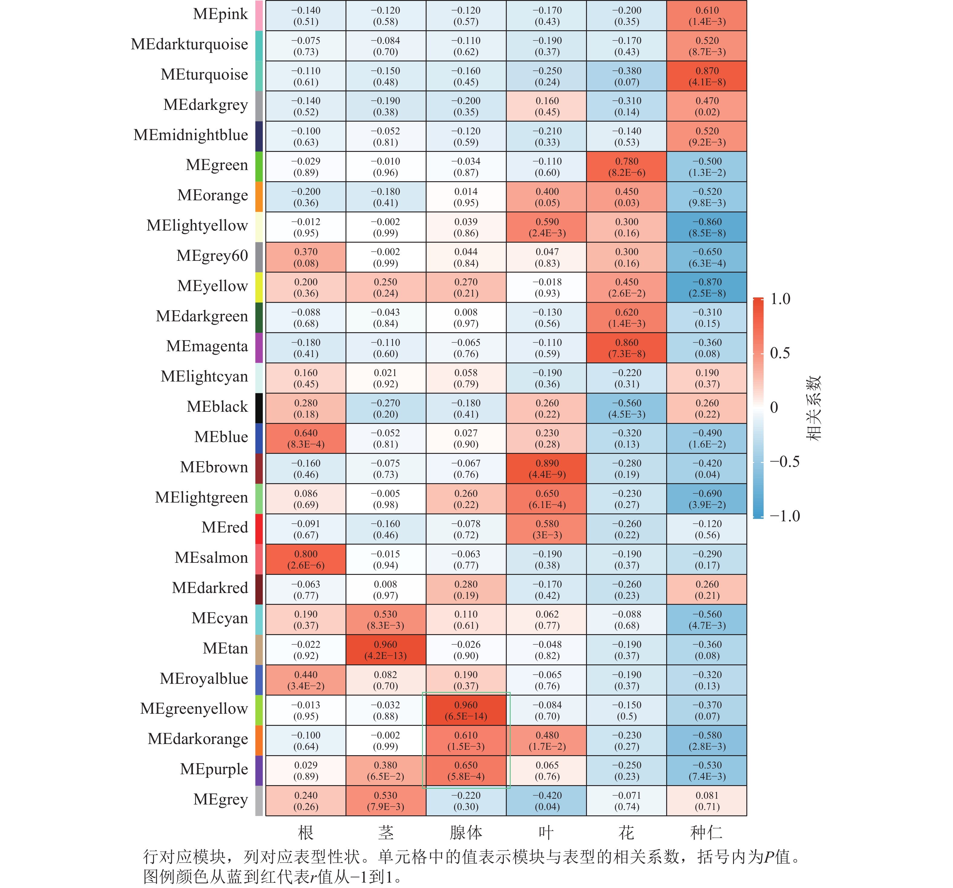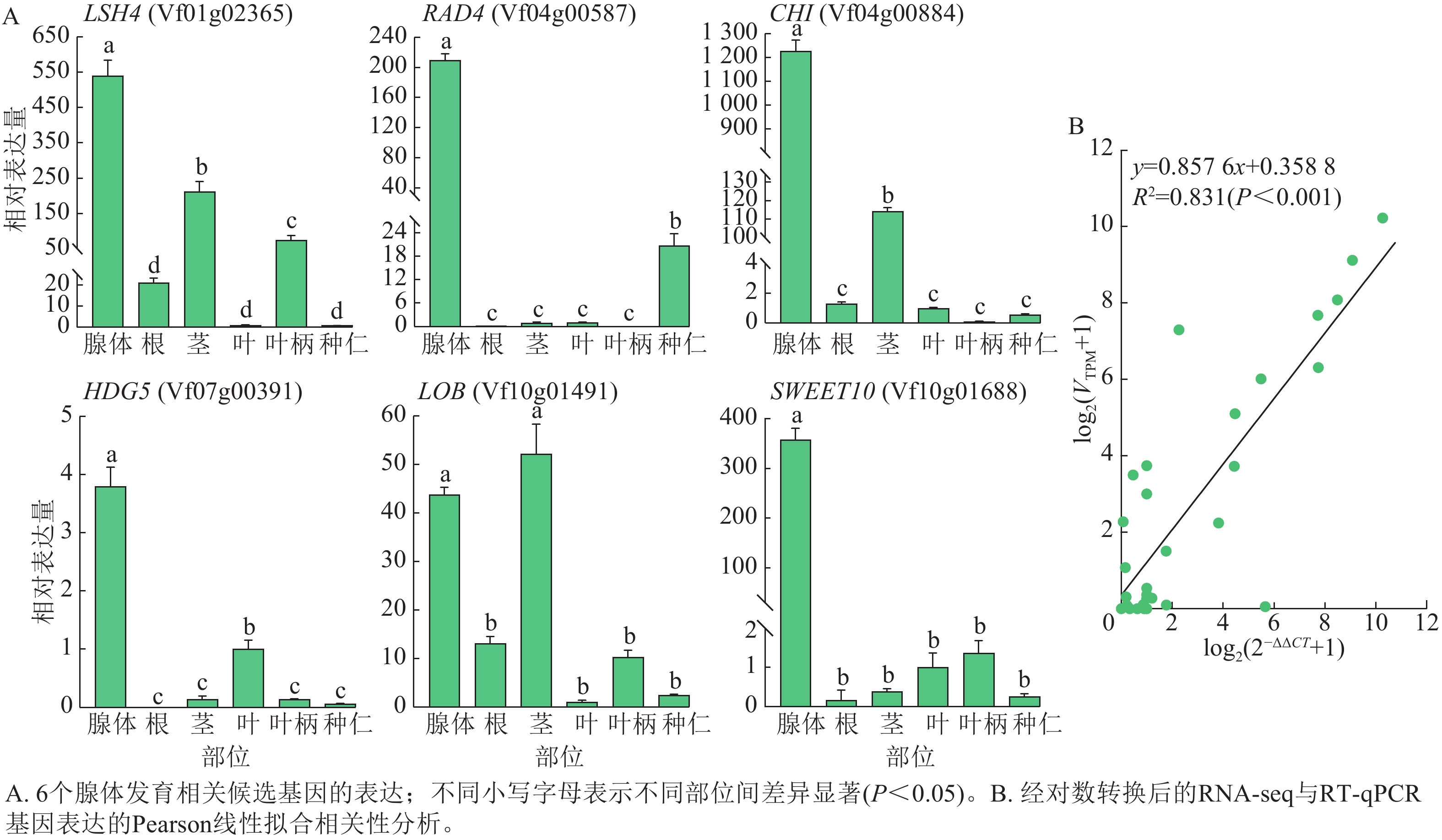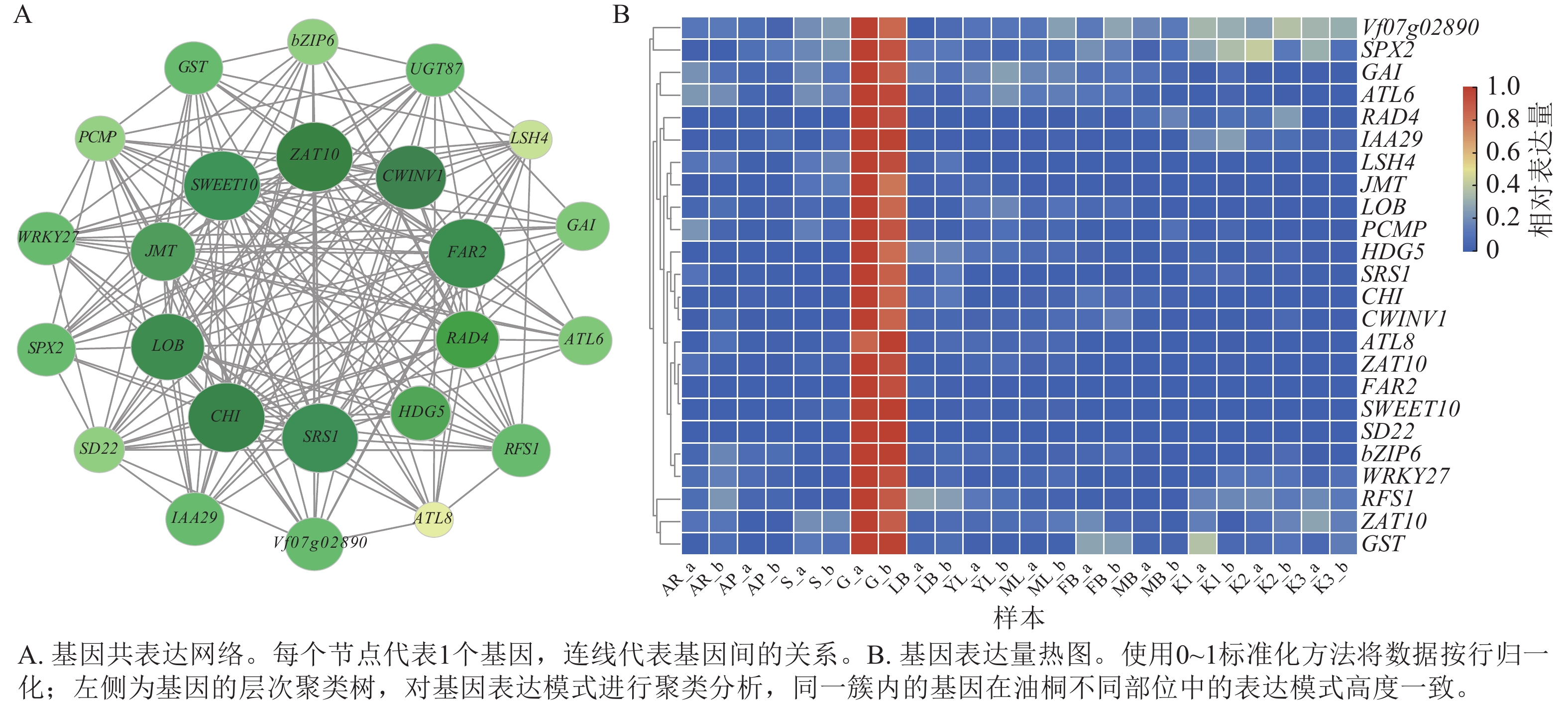 Objective The objective is to identify tissue-specific modules related to gland development in Vernicia fordii and to screen core regulatory genes, so as to lay a foundation for further in-depth analysis of gland ontogenesis and provide theoretical support for the study of the developmental mechanisms of plant secretory tissues such as secretory cavities and glandular trichomes. Method Based on transcriptome sequencing (RNA-seq) data of 12 tissue parts and developmental stage combination samples of V. fordii, combined with weighted gene co-expression network analysis (WGCNA), the tissue-specific modules related to glands were identified. Core genes were screened through functional enrichment analysis of hub genes within the module, protein-protein interaction (PPI) network construction, and gene interaction network clustering analysis. Quantitative reverse transcription PCR (RT-qPCR) was subsequently applied to verify the expression patterns of candidate genes in different parts of the tree. Result WGCNA clustered the 12 943 filtered genes into 27 co-expression modules, and identified the greenyellow module that was highly related to the gland development. Gene Ontology (GO) and Kyoto Encyclopedia of Genes and Genomes (KEGG) enrichment analysis revealed that hub genes within this module were mainly involved in biological processes such as growth, anatomical structure development, cell differentiation, protein metabolism, light signal perception response, and biotic stress response, and were enriched in related pathways such as transporters, the ubiquitin system, signal transduction, and environmental information processing. Based on the interaction network of genes within the module and gene functional annotations, several genes such as LSH4, RAD4, HDG5, GHI, LOB, and SWEET10 were identified as potential key regulators in gland development. RT-qPCR verification results showed that the expression of each candidate gene in different parts of V. fordii exhibited significant tissue specificity, and its expression trend was highly consistent with the RNA-Seq data. Conclusion One tissue-specific module related to gland is identified, and core genes (RAD4, GHI, SWEET10), which are closely related to gland formation and development, are screened. [Ch, 8 fig. 3 tab. 44 ref.]