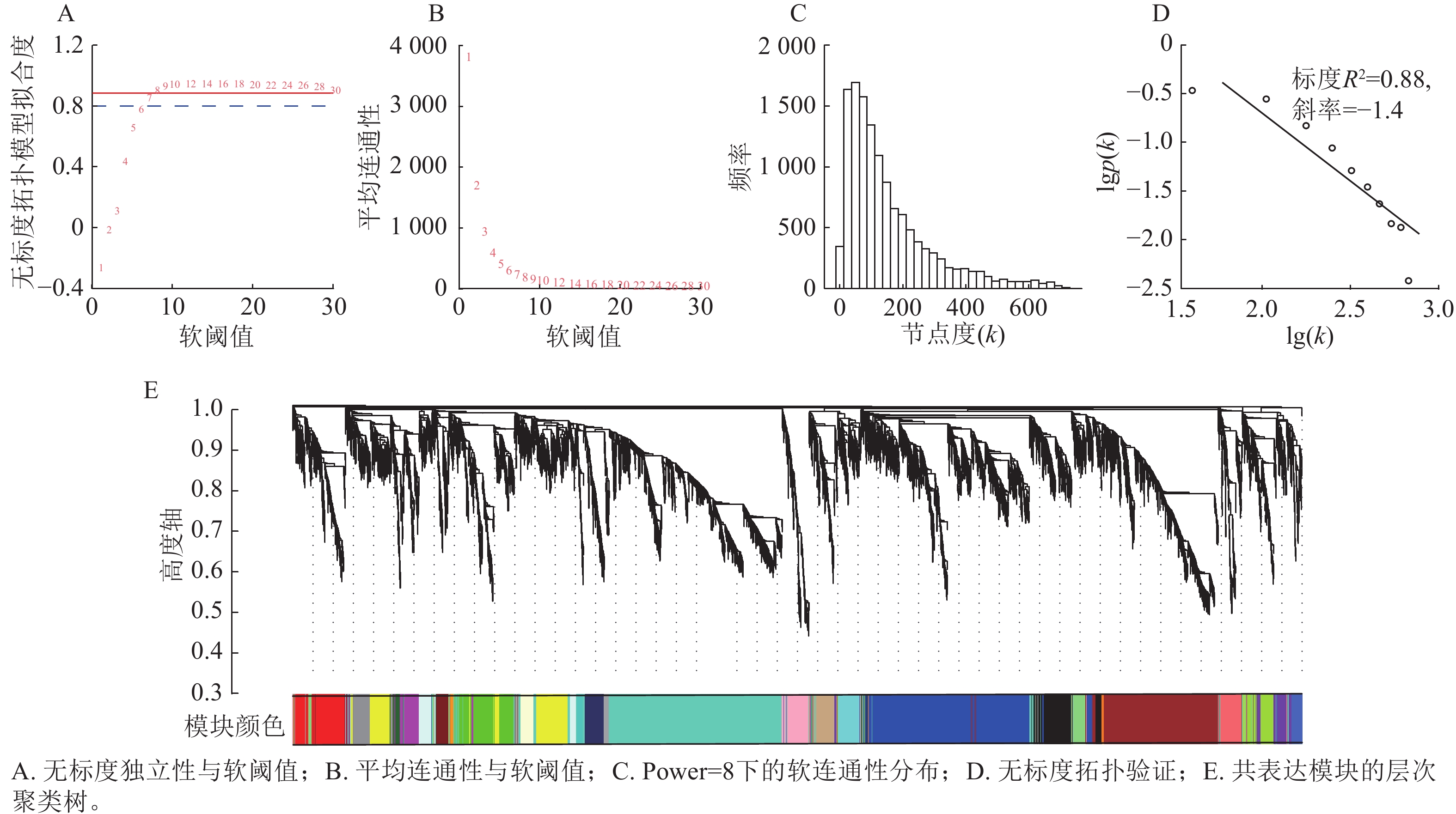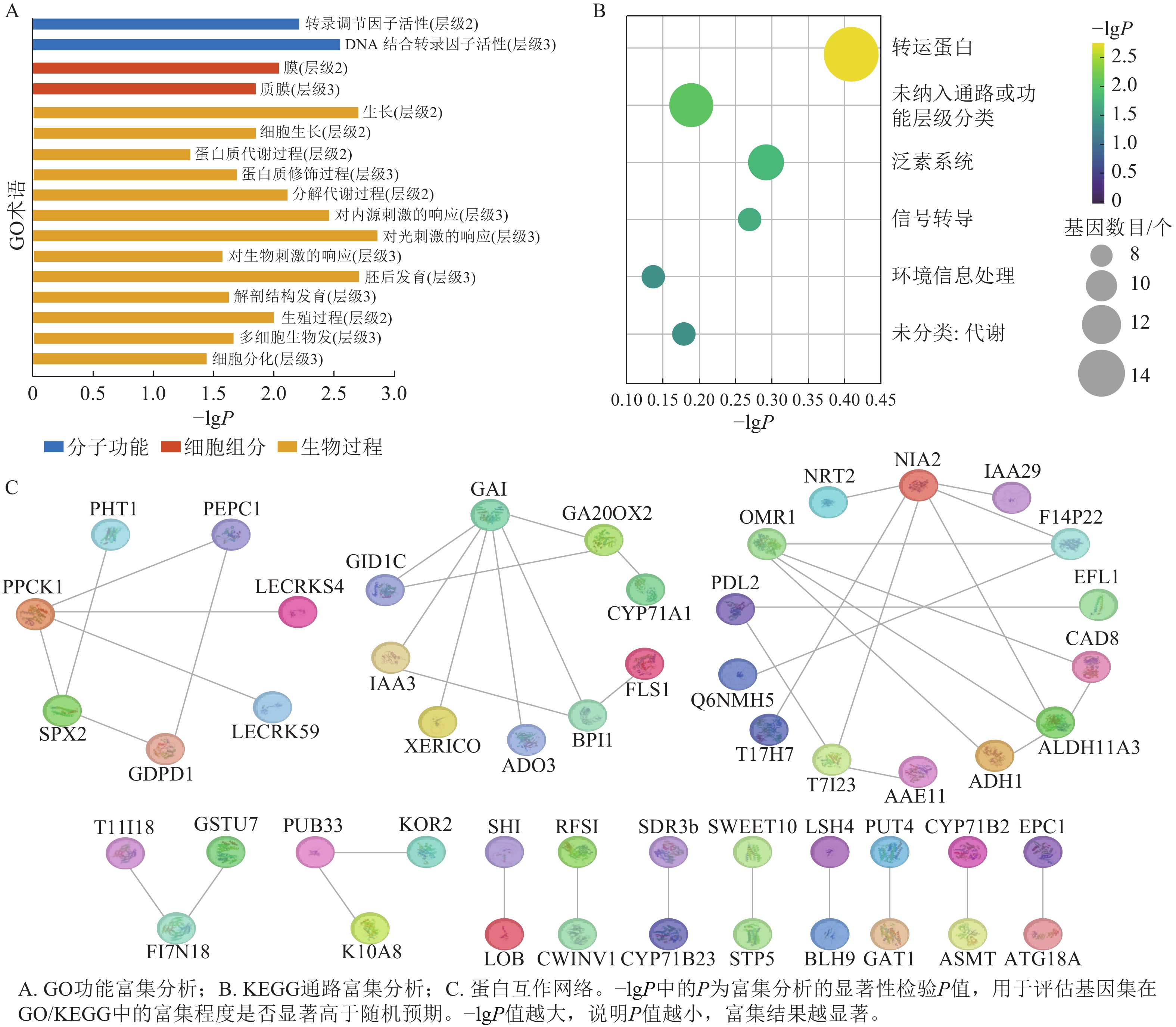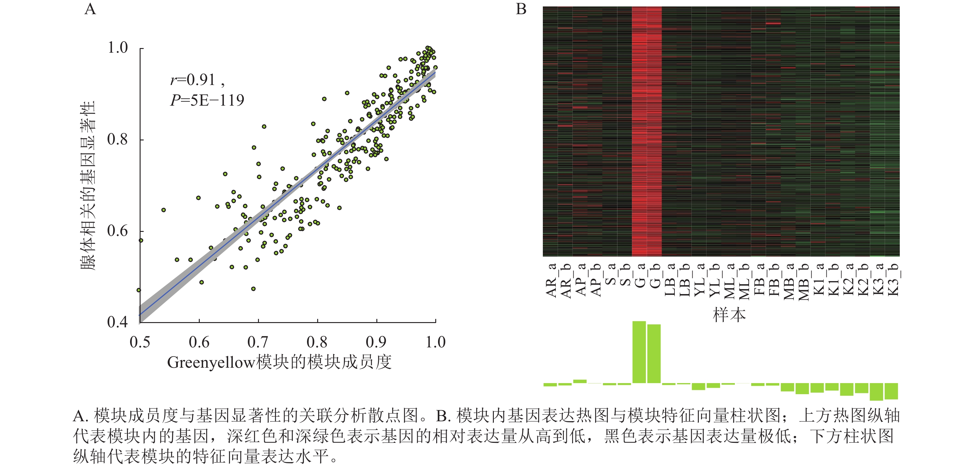 Objective The objective is to identify tissue-specific modules related to gland development in Vernicia fordii and to screen core regulatory genes, so as to lay a foundation for further in-depth analysis of gland ontogenesis and provide theoretical support for the study of the developmental mechanisms of plant secretory tissues such as secretory cavities and glandular trichomes. Method Based on transcriptome sequencing (RNA-seq) data of 12 tissue parts and developmental stage combination samples of V. fordii, combined with weighted gene co-expression network analysis (WGCNA), the tissue-specific modules related to glands were identified. Core genes were screened through functional enrichment analysis of hub genes within the module, protein-protein interaction (PPI) network construction, and gene interaction network clustering analysis. Quantitative reverse transcription PCR (RT-qPCR) was subsequently applied to verify the expression patterns of candidate genes in different parts of the tree. Result WGCNA clustered the 12 943 filtered genes into 27 co-expression modules, and identified the greenyellow module that was highly related to the gland development. Gene Ontology (GO) and Kyoto Encyclopedia of Genes and Genomes (KEGG) enrichment analysis revealed that hub genes within this module were mainly involved in biological processes such as growth, anatomical structure development, cell differentiation, protein metabolism, light signal perception response, and biotic stress response, and were enriched in related pathways such as transporters, the ubiquitin system, signal transduction, and environmental information processing. Based on the interaction network of genes within the module and gene functional annotations, several genes such as LSH4, RAD4, HDG5, GHI, LOB, and SWEET10 were identified as potential key regulators in gland development. RT-qPCR verification results showed that the expression of each candidate gene in different parts of V. fordii exhibited significant tissue specificity, and its expression trend was highly consistent with the RNA-Seq data. Conclusion One tissue-specific module related to gland is identified, and core genes (RAD4, GHI, SWEET10), which are closely related to gland formation and development, are screened. [Ch, 8 fig. 3 tab. 44 ref.]