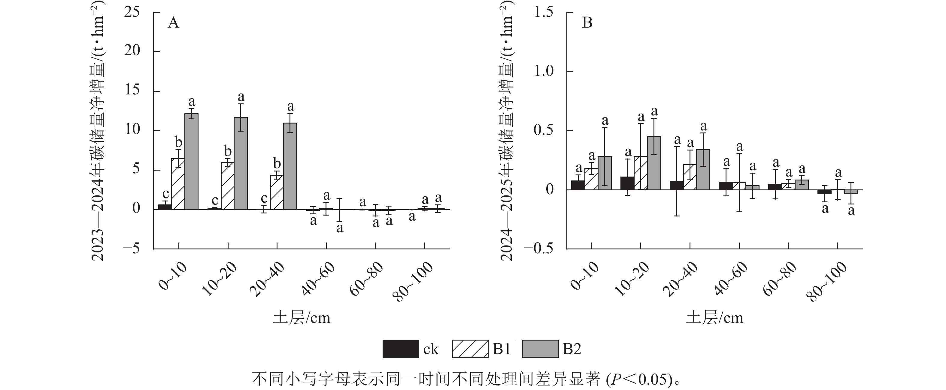 Objective This study aims to investigate the effects of biochar application on the carbon sequestration capacity of Populus (poplar) plantation ecosystems and the main underlying regulatory mechanisms, in order to provide theoretical and technical support for forest management practice of balancing timber production and carbon sequestration capacity in artificial forests in China. Method From 2023 to 2025, a one-year old poplar artificial forest was selected as the research object in Malanghu Forest Farm, Sihong County, Jiangsu Province. Three treatments were set up: a control without biochar application (ck), low biochar application rate (B1, 30 t·hm−2), and high biochar application rate (B2, 60 t·hm−2). The short-term effects of different biochar application rates on the carbon sequestration capacity of each carbon layer in the poplar plantation were explored. Result (1) Compared with ck, B1 and B2 treatments significantly promoted the growth of the diameter at breast height (DBH) and tree height of poplar trees for two consecutive years, among which B2 treatment had the most significant promoting effect (P<0.05). (2) One year after biochar application, both B1 and B2 treatments significantly promoted the net increment of carbon storage in the arbor layer, herb layer, litter layer, and soil layer compared with ck (P<0.05). However, in the second year, there was no significant difference in the net increment of carbon storage in each layer compared with ck, indicating that a single application of biochar was not sufficient to maintain the long-term growth of poplar trees. Instead, biochar exerted a continuous effect through more stable improvement of soil properties. (3) One year after biochar application, all treatments significantly increased the soil carbon storage in the 0−40 cm soil layer (P<0.05), but had no significant effect on the 40−100 cm soil layer, indicating that the increase in soil carbon storage mainly originated from the one-time application of biochar in the 0−40 cm soil layer. (4) Correlation analysis showed that the carbon storage in each carbon layer was significantly or extremely significantly positively correlated with soil total nitrogen (TN), total phosphorus (TP), available phosphorus (AP), ammonium nitrogen (\begin{document}${\mathrm{NH}}_4^+ $\end{document} -N), nitrate nitrogen (\begin{document}${\mathrm{NO}}_3^- $\end{document} -N), carbon-to-nitrogen ratio (C/N), and pH (P<0.05 or P<0.01). Redundancy analysis (RDA) indicated that TN was the primary contributing factor affecting the carbon storage in each layer of the ecosystem. Conclusion Biochar application can significantly promote the carbon sequestration capacity of the arbor layer, herb layer, litter layer, and soil layer in young poplar plantations, and is conducive to sustained and stable promotion of the rapid growth of DBH and tree height of poplar trees, thereby improving comprehensive carbon sequestration and sink increment capacity of young poplar plantations. Among them, a high biochar application dose of 60 t·hm−2 (B2) can achieve short-term rapid and stable carbon sequestration, exhibiting a better promoting effect. [Ch, 5 fig. 1 tab. 36 ref.]